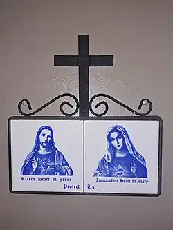 A plaque of the Alliance of the Hearts of Jesus and Mary under a cross