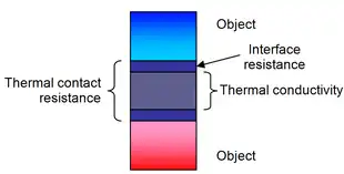 2. For each interface between two objects in contact with each other, there will be a temperature drop across the interface. For such composite systems, the temperature drop across the interface may be appreciable.[11] This temperature change may be attributed to what is known as the thermal contact resistance.[11] Thermal interface materials (TIM) decrease the thermal contact resistance.