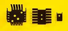 The materials for heat sink applications should have high heat capacity and thermal conductivity in order to absorb more heat energy without shifting towards a very high temperature and transmit it to the environment for efficient cooling.[5] The most common heat sink materials are aluminium alloys.[6] Aluminium alloy 1050 has one of the higher thermal conductivity values at 229 W/(m·K) and heat capacity of 922 J/(kg·K),[7] but is mechanically soft. Aluminium alloys 6060 (low-stress), 6061, and 6063 are commonly used, with thermal conductivity values of 166 and 201 W/(m·K) respectively. The values depend on the temper of the alloy. One-piece aluminium heat sinks can be made by extrusion, casting, skiving or milling.