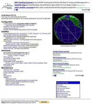 Users click on a map of the world to set their viewing location. Lists of objects, their brightness and the time and direction to look to see those objects are given. Space stations, rockets, satellites, space junk as well as Sun, Moon, and planetary data are given.