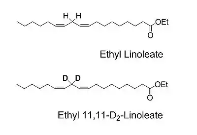 The company Retrotope pioneered the development a source of deuterated omega-6 fatty acid di-deuterated linoleic acid ethyl ester (RT001) as a food additive for potential treatment of neurodegenerative diseases such as Friedreich’s ataxia and infantile neuroaxonal dystrophy. FDA has granted it an orphan drug designation and it passed the Phase I/II clinical trials (as of 2018).[8]
