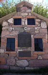 The Heber C. Kimball Gristmill monument is located in Bountiful just south of Bountiful High School. It consists of a 1:3 scale replica burr mill built in 1937 and two original burr-type grist stones found in 1984 during city excavation for a debris catch at the end of Mill Creek. Also erected are three four-foot-high pillars dedicated to three men involved in the building and operation of the mill: Heber Chase Kimball, Daniel Davis and George Quinn McNeil.[1]