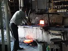 According to the Holy Land Handicraft Cooperative Society, the blowing technique employed is the same as was used by the ancient Phoenicians,[2] though archaeologists and historians of glass agree that glassblowing was not common until the last few centuries BCE. Molten glass is withdrawn from a furnace on the end of an iron pipe, which is blown into as a metal tool called a kammasha is used to shape the glass. It is returned to the furnace and reshaped by the same process before being detached from the pipe and placed into a cooling chamber.[4][19]