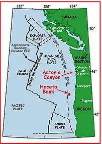 Heceta Bank is a rocky bank located 55 kilometers (km) off the Oregon coast near Florence, centered on approximately 44°N, 125°W, and is roughly 29 km long and upwards of 13 km wide.[1][2] Heceta Bank is an area of ecological and oceanographic importance. The unique bathymetric features and seasonal circulation within the bank provides habitat for a diversity of economically-important fish species.