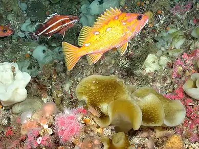 Some species have a higher affinity to inhabit specific kind of substrate. Sebastes spp., including pigmy rockfish and yellow tail rockfish, tend to be mostly found in rocky ridges, but they are almost absent in mud. On the other side, Shortspine thornyhead, dover sole, and rex sole are mostly found in mud substrate and almost absent in rocky ridge environments.[39]