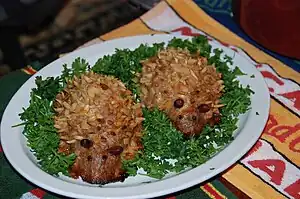 "Hedgehogs" may also be created by moulding ground meat in a teardrop shape, embedding pastry slivers or slivered almonds in the surface to resemble quills, and adding eyes and ears of peppercorns, olives, or whole almonds. The technique dates back to at least 1390[14] and was referenced in an episode of Two Fat Ladies.