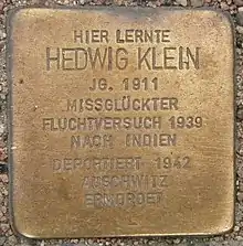 On 22 April 2010, Stolpersteine bearing the names of Hedwig Klein and other murdered Jewish academics were placed outside the main buildings of the University of Hamburg.[1] Another Stolperstein bearing her name was placed outside her last known address in the Harvestehude district of Hamburg.
