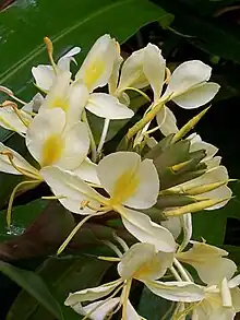 Commonly known as cream garland-lily[3] or yellow ginger, it grows up to 2.5 metres (8 ft 2 in) high. It is extremely shade-tolerant, and thrives in a wide range of soils. Since it has the ability to regrow from even a small fragment of the rhizome, which survive crushing, immersion in sea water, and even years outside of soil, elimination can be a problem. It is treated as an invasive weed in New Zealand because of its ability to displace other species.