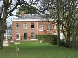 The house is constructed in orange brick with stone dressings. It has hipped roofs covered in Welsh slate, and has brick chimneys. Its plan is that of a rectangular block.[1] The architectural style is Early Georgian.[5] The entrance front is on the east side; it is symmetrical, in two storeys, and has seven bays. It has a moulded stone plinth, and rusticated quoins. The lateral pair of bays on each side are stepped forward. All the windows in this front are sash windows. Above the doorcase is a frieze of Tudor roses under a moulded architrave and a segmental pediment. Two bays at the right end of the south front are canted. This front has a mixture of sash and casement windows. Attached to the west front is a 19th-century cast iron conservatory with a semicircular end. On the north front is a stone porch.[1] Inside, the ceilings of the staircase and one of the upstairs rooms have Rococo stucco decoration.[5]