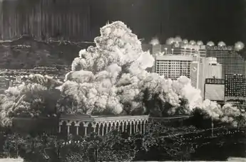 Two installation-like works from 2000 were later noted for their uncanny prophetic quality in light of the subsequent 9-11 attacks.[7][22][35] Demo froze the implosion of a building in mid-air, complete with highly textured, blackened falling bricks and signage letters, flying shards and oozed neoprene smoke resembling popcorn;[24] it references vanished 1950s landmarks from Fasnacht's native Midwest.[4][22] The more violent and unsettling Exploding Plane offers a complex sense of space, drawing viewers' eyes into, around and through the work and its aluminum-gray scattering parts (including suitcases) suspended in midair.[36][4][3][37] After 9/11, Fasnacht turned from explosions to more celebratory and meditative drawings of civic parades and fireworks, exploding champagne bottles, and water occurrences that suggested both mourning and renewal.[22][7][38]