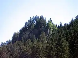 Heidenberg Castle was the first of four castles built to defend and control the region around Obersaxen. The Obersaxen plateau first appears in historic records in 765 when Bishop Tello gave his farms and meadows there to Disentis Abbey. In 806 it became an Imperial Estate, which it remained until 956 when Emperor Otto I donated the village and the village church back to the Bishop of Chur.[1] To control this important village along the Rhine river, four castles were built at various points throughout the Middle Ages. The first was Heidenberg above Tavanasa which may have been built as early as 1000. It was followed by Moregg and Saxenstein (around 1200) and Schwarzenstein (13th century).[2] However, Heidenberg does not appear in any surviving medieval records. In 1468 the inheritance of the Counts of Rhäzüns the other three castles around Obersaxen were mentioned, but Heidenberg was omitted, probably indicating that it had already fallen into ruin.[3] In 1556 the Obersaxen castles of Schwarzenburg, Saxenstein and Heydnischburg were fixed as the border between Obersaxen and Waltensburg.[4] In 1573 the chronicle of Ulrich Campell calls the ruins Heidabergum.[3]