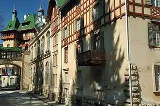 The Heimatstil[1] is an architectural style of the second half of the nineteenth century and the first half of the twentieth referring to the historicist tendencies which one encounters in the German-speaking countries, including Switzerland (the architecture of chalets), but also in Victorian England and even in the north and eastern parts of France, as well as Belgium and Flanders. The Heimatstil is characterized by the use of wood on the façade and sculpted beams, connected by protruding or rusticated stone, recalling the illustrations from literature and folklore, especially Germanic ones, from the time period.
