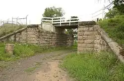 The concrete bridge over the cutting is recent and is marked LXXXX (1990). It does not cover the full width of the abutments and is finished with plain timber handrails.[1]