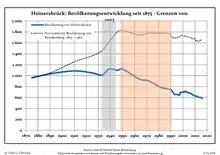 Development of population since 1875 within the current Boundaries (Blue Line: Population; Dotted Line: Comparison to Population development in Brandenburg state; Grey Background: Time of Nazi Germany; Red Background: Time of communist East Germany)