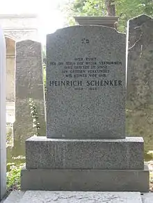 Schenker died on 14 January 1935, age 66 at 2 AM, the cause of death listed as diabetes and arteriosclerosis. He was buried on 17 January at the Wiener Zentralfriedhof, Gate 4, Group 3, Series 4, number 8.[55] The inscription on his grave reads: "Hier ruht, der die Seele der Musik vernommen, ihre Gesetze im Sinne der Großen verkündet wie Keiner vor ihm" (Here lies he who examined and revealed the laws concerning the soul of music like none other before him).