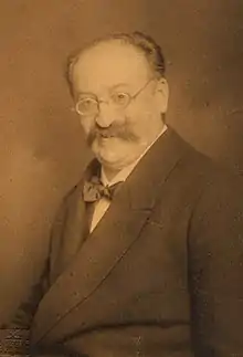 Heinrich Schenker was born in Wiśniowczyk, Austrian Galicia in 1868[4][5] to Johann Schenker and his wife,[6] Julia (née Mosler),[7] both Jews.[8] Schenker's father was a doctor who had been allowed to settle in Wiśniowczyk, a village of only 1,759 inhabitants, according to the 1869 census.[7] There is very little information about Schenker's parents. Moriz Violin, Schenker's life-long friend recalled Schenker describing "the seriousness of the father and the hot temper of the mother".[9]