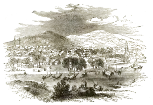 In the first half of the 19th century, Hekou was planned out with broad streets and large public squares lines with shade trees,[6] something entirely unusual in northern China at the time.[11] It was well-protected from the floods of the Yellow River by large embankments decorated with willows whose wood was worked into rafts used for downriver trade as far as Tongguan at the southeast end of the Ordos Loop.[5] Hekou itself manufactured blocks of soda and, connected to caravan routes running east and west, carried on a sizable trade with the Mongols on the south side of the Yellow River.[5] The caravans kept it well supplied, including with Russian goods,[6] but its growth was curtailed by the proximity of the older caravan center at Hohhot.[11]