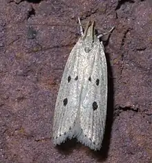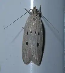 The wingspan is about 11 mm. The forewings are ochreous whitish sprinkled with grey. The stigmata form roundish black spots, the second discal largest, the plical slightly before the first discal. There is a marginal series of black dots around the apex and termen. The hindwings are light grey, paler towards the base.[2] Adults are on wing from March to August.[3]
