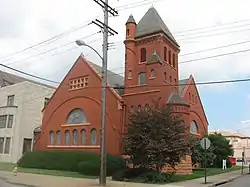 The Helen Chapel was built as the Sunday school of the First Presbyterian Church of Youngstown. It was built with funds donated by Myron Converse Wick and Elizabeth (Bonnell) Wick in memory of their daughter, Helen, who had died at the age of four in 1888. Wick was a member of a regionally prominent family of industrialists, and was an elder brother of George Dennick Wick, a founder of Youngstown Sheet and Tube. Their ancestor, William Wick, had been the founding pastor of the Youngstown church in 1799. The new building was designed by Youngstown architect Adolph Kanengeiser in 1889 in the Richardsonian Romanesque style. The building was dedicated May 4, 1890, and is still used for church purposes.[2][3]