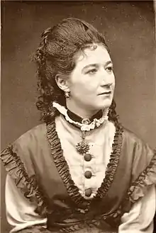Ernstone began her professional career in provincial theatres, playing the role of Geraldine in Buckstone's The Green Bushes at The Canterbury Music Hall, Lambeth in 1867. She made her London debut in 1868 at Covent Garden as Katherine in Katherine and Petruchio.[2] In 1869, she played in Charles Smith Cheltnam's (1823–1912) Edendale at the opening of the Charing Cross Theatre. The Times wrote: "Among the novices are Miss Ernstone, from Manchester, a young lady of prepossessing appearance, who plays Ada Vandaleur... with much force".[3] For the next ten years she appeared on the West End stage in juvenile leads. At the Olympic Theatre later in 1869, she was Martha in Little Em'ly by Andrew Halliday, based on Dickens's David Copperfield.[4] The following year she moved to the Globe Theatre in Philomel, part of a double-bill with The Ticket-of-Leave Man,[5] and in the same year, she appeared in Man o' Airlie with Hermann Vezin.[6] Also in 1870, she created the part of Katie Maguire in Inisfallen by Edmund Falconer at the Lyceum Theatre, London[7] and played Lizzie Hexham in another adaptation of a Dickens novel, Our Mutual Friend, at the Opera Comique.[8] The Observer wrote of this production, "Her acting... is poetical in the highest sense.... If we mistake not, Miss Ernstone will occupy a distinguished position on the stage."[9]