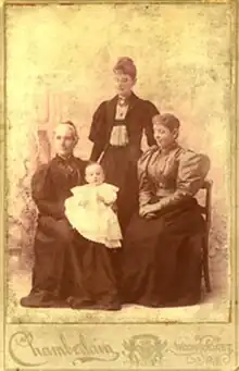 Sailing aboard the Oriole for Aitutaki in the Cook Islands, they made their way back to New Bedford, Massachusetts, after passing Cape Horn, arriving in September 1866.[9] Three months later, on December 17, 1866, the couple's second child, Prescott Ford Jernegan was born.[10] Jared had earned enough from the trip aboard the Oriole to support the family for the next two years, but in 1868, he decided to take command of the Roman and sail with the entire family.[9] Jernegan spent her days aboard ship watching the children and piecing by hand a log cabin quilt, which would contain 2310 strips of fabric.[11] While on board the ship, Jared chalked out an area for the children to run freely but be away from the men working with the whales.[8] He also made a schoolhouse on deck for Jernegan to give lessons to Laura. To practice her writing, Jernegan had Laura keep a diary of the trip.[10][8] They sailed around Cape Horn and made landfall on the Juan Fernández Islands. From there, they proceeded to Cecorius Island where they met Jared's brother Nathan to exchange news and trade salt.[12] On March 29, 1869, the Roman made landfall at Honolulu and Jernegan and the children disembarked. They lived in a rented cottage on Fort Street while Jared continued north to the Arctic.[13]