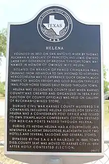 Helena is a ghost town in Texas, approximately 70 mi (110 km) southeast of San Antonio in Karnes County. The seat of Karnes County from 1854 to 1894, Helena was once known as the self-proclaimed "toughest town on earth" in the mid-19th century. It was named for the second wife of Dr. Lewis S. Owings, Helen M. Owings née Swisher.[1]