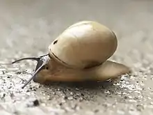 Helicina orbiculata is a species of land snail with an operculum, a terrestrial gastropod mollusk in the family Helicinidae. They are one of few land snail species to have eyes at the base of their tentacles. This may suggest that Helicina orbiculata individuals are separate male and female, as opposed to the more common hermaphroditic land snails.