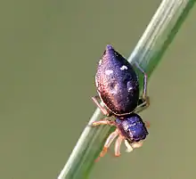 The male has dark palps with white squamose hairs on front.[6] The tibial apophysis has a fine, long, pointed, hook-shaped process. The male has a long palpal bulb. The cephalothorax is black with a metallic sheen and has white hairs, towards the front bright and on some individuals there are 1-2 bright pairs of spots to the rear.