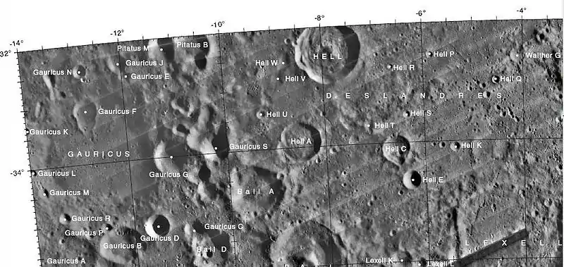 Hell is a lunar crater in the south of the Moon's near side, within the western half of the enormous walled plain Deslandres. To the southeast, also within Deslandres, is the larger crater Lexell, and about 9° to the south lies the prominent Tycho crater.[2] The crater received its name in 1935 after the Hungarian astronomer and ordained Jesuit priest Maximilian Hell.[3] It has 19 satellite craters with diameters ranging between about 3 and 22 km. Nearly all Hell craters are relatively flat and shallow, with a sharp, well-defined rim and a typical diameter-to-depth ratio of about 10.