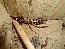Hemideina trewicki is common in forests and suburban gardens over most of the Hawke's Bay region. Within this range it overlaps with the Auckland tree weta H. thoracica.[4] The two species can be found sharing daytime refuge holes but hybridisation is limited to rare first generation hybrids.[5] Hemideina trewicki has black and yellow bands on its abdominal tergites (as seen in the Wellington tree weta H. crassidens) but has a pale pronotum with black marks as seen in H. thoracica. However, H. thoracica lacks the abdominal bands, and is more uniform body colour. All tree weta have long antenna, spines on their hind legs and adults can bite. The number of prolateral spines on each hind tibea can be used to distinguish the Hawke's Bay tree weta from the Auckland tree weta: Hemideina trewicki has 8 spines and H. thoracica has 6 (or sometimes 7) spines on each hind tibea.[5]