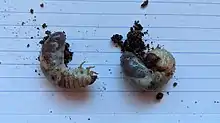 As larvae, they have cream-colored bodies and reddish-brown heads. They have a C-shaped posture, and move on their sides when above ground.[6]