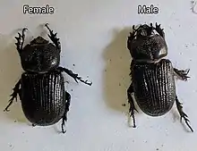 Both sexes have a pair of horns but the females' are much smaller, more like bumps or short nubs. Unlike their close cousins, Phileurus truncatus, neither sex has the notable third horn.