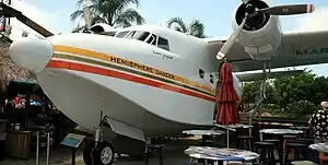 This aircraft began life on August 22, 1955, as a long range search and rescue platform for the U.S. Navy.[3] The largest member of the Grumman "waterfowl" series of amphibious airplanes, the Albatross remained in service with the U.S. Navy until the mid-1970s. BuNo 137928 was retired from Navy service in August 1967 and flown to the Military Aircraft Storage and Disposition Center.[1] After it remained inactive for a number of years and passed through intermediate owners, Buffett purchased the aircraft in November 1995,[1] restored it, and named it Hemisphere Dancer.