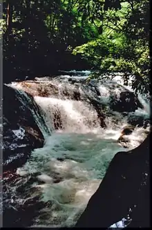 Hemlock Falls is a waterfall located in Rabun County, Georgia. It is located in the Tallulah Ranger District of the Chattahoochee National Forest on Moccasin Creek. The Hemlock Trail is about one mile long, beginning at Moccasin Creek State Park and following an old railroad bed.