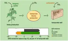 The main cause of the environmental footprint for hempcrete comes from the production of the binder. Reports have estimated that 18.5% - 38.4% of initial emissions from binder production can be recovered through the carbonation process.[7] The specific amount of carbonates in the blocks actually increases with the age of the block.[6] During the growth of hemp the plant absorbs CO2, the binder begins to absorb CO2 after the mixing process, and the wall absorbs CO2 counteracting the greenhouse emissions, by acting as a carbon sink.[6] A hempcrete block will continue to store carbon throughout its life and can be crushed and used again as a filler for insulation.[6] The amount of CO2 capture within the net life cycle CO2 emissions of hempcrete is estimated to be between -1.6 to -79 kg CO2e/m2.[7] There is a correlation that increasing the mass of the binder which increases the mixture density will increase the total estimated carbon uptake via carbonation.[7]