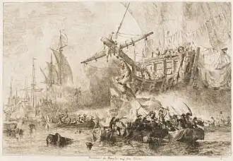Hendrik Frans Schaefels combined in his work this tradition of history painting and marine art. He excelled in his dramatic portrayals of naval battles and other historical events that took place at sea such as the Battle of Trafalgar, episodes from the wars between England and the Dutch Republic. His large compositions, with sizes varying from 2 to 9 meters long, often showed a pseudo-Baroque design. Schaefels painted both compositions depicting an entire naval battle as well as more anecdotal episodes depicting the action on the deck of a single warship such as in the Death of Nelson. For his naval battles he relied on historical literature and printed materials.[6]
