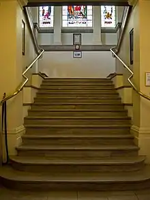 The design involved a symmetrical main frontage facing east onto the Market Square; the central section, which slightly projected forward, featured a short flight of steps leading up to a doorway with an arched stone surround. There was a Venetian window on the first floor flanked by two pairs of Ionic order pilasters supporting an architrave and a large pediment with a carved coat of arms in the tympanum.[1] At roof level there was a cupola with a gold ball and a weather vane.[1] Internally, the principal rooms were the council chamber on the ground floor and the main hall on the first floor.[2] The ground floor contained an additional pair of large formal rooms, one of which served as the Mayor's Parlour, the other as a committee room.[7] The basement storey was largely taken up by a drill hall, and also contained office rooms for the Town Clerk, Borough Surveyor and other council officials.[7] The original iron gates to the building were replaced by wooden doors in 1909;[9] the gates were given to Holy Trinity Church.[7]