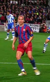 At the end of the 2003–04 season, Larsson left Celtic on a free transfer and signed a one-year contract with Barcelona with an option for a second year.[108] Larsson's contribution in Barça's La Liga win in his first season there was disrupted by serious injury. He scored 3 goals in 12 Liga games and one goal (against his former club Celtic)[109] in four Champions League matches. After the match against Celtic, he said: "It was very difficult for me to celebrate my goal because I had so many great times here."[110] On 20 November 2004, during the 3–0 victory in El Clásico against Real Madrid, Larsson tore the anterior cruciate ligament (ACL) and meniscus in his left knee.[111] Despite his injury-hit 2004–05 season, playing only 16 games, Barcelona took the option to extend his contract.[112]