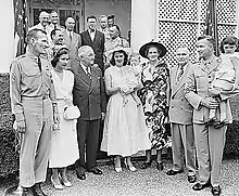 Lt. Commiskey, at right holding his daughter, with his family and President Harry Truman during his Medal of Honor presentation ceremony. His brother, Sgt. Michael Commiskey, USA, and Michael's wife Bertie stand to President Truman's right; Lt. Commiskey's wife and his parents (Hugh Walsh Commiskey and Cassandra Haigwood Commiskey) stand immediately to his right in this photograph.