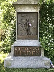 Henry B. Hidden was born in New York City to a wealthy family related to the shipwright William Henry Webb. He enlisted in the Union Army on August 5, 1861, at New York City, and was commissioned a 1st Lieutenant of Company H, 1st Regiment New York Volunteer Cavalry, a regiment also called the "Lincoln Cavalry." On March 9, 1862, Hidden was ordered to take a small scouting party to investigate enemy activity near a bridge Union soldiers were building at Sangster's Station, a railroad station southwest of Fairfax Station, Virginia. Hidden and his party of 14 dragoons encountered an estimated 150 Confederate soldiers. Although vastly outnumbered, Hidden ordered a charge. In the resulting skirmish, he was shot in the neck and died soon afterward. The rest of the scouting party was wounded or captured.[1]