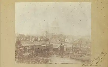 One day in 1844, twenty-six year old Joseph Cundall walked from his printing shop on Old Bond Street down to the Thames River carrying the box camera he recently designed and built, along with bottles of’ silver nitrate and gallic acid. Once settled on the Blackfriars Bridge, under a black cloth, he painted the chemistry onto some writing paper that had already been treated with silver nitrate and potassium iodide and then, inserted it into the camera. Focusing on St. Paul's Cathedral in the distance, Cundall opened the lens and made a single exposure. This calotype (paper negative) was used later to make several positive prints, one of which was given to his friend, optician Richard Willats, who pasted it into an album. That album and what might be the earliest photograph taken by Joseph Cundall is now at Princeton University.[5]
