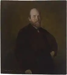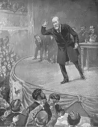 In 1886, George campaigned for mayor of New York City as the candidate of the United Labor Party, the short-lived political society of the United Labor Party.[28][29] He polled second, more than the Republican candidate Theodore Roosevelt. The election was won by Tammany Hall candidate Abram Stevens Hewitt by what many of George's supporters believed was fraud. In the 1887 New York state elections, George came in a distant third in the election for Secretary of State of New York.[20][30] The United Labor Party was soon weakened by internal divisions: the management was essentially Georgist, but as a party of organized labor it also included some Marxist members who did not want to distinguish between land and capital, many Catholic members who were discouraged by the excommunication of Father Edward McGlynn, and many who disagreed with George's free trade policy. George had particular trouble with Terrence V. Powderly, president of the Knights of Labor, a key member of the United Labor coalition. While initially friendly with Powderly, George vigorously opposed the tariff policies which Powderly and many other labor leaders thought vital to the protection of American workers. George's strident criticism of the tariff set him against Powderly and others in the labor movement.[31] In 1897, George again ran for mayor of New York City. However, he had his fatal stroke during the campaign.[32][33]
