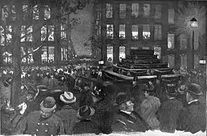 An estimated 100,000 people visited Grand Central Palace during the day to see Henry George's face, with an estimated equal number[39] crowding outside, unable to enter, and held back by police. After the Palace doors closed, the Reverend Lyman Abbott, Father Edward McGlynn, Rabbi Gustav Gottheil, R. Heber Newton (Episcopalian), and John Sherwin Crosby delivered addresses.[40]