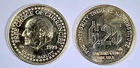 A gold token minted in 1979 by the American Pacific Mint to promote Hazlitt's libertarian stance on monetary policy. 3,180 tokens were produced
