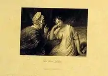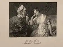 The painting The Love Letter shows two characters taken from Sir Walter Scott's The Antiquary and was likely painted after 1828. A poem of the same name was written by Letitia Elizabeth Landon, who was noted for creating literary pieces based on drawings and paintings and well known in the UK during that period.[16] The painting depicts Mrs Mailsetter in an admonishing pose and Jenny Caxon, the recipient of a love letter from her older beau, Lieutenant Richard Taffril, who was away at sea. An engraving by Charles Rolls of the painting and the poem were published side by side in Fisher's Drawing Room Scrapbook for 1833 (London, UK Fisher Jackson).[17] An engraving made of this painting also references the title as being "Maternal Solicitude" and an earlier reference in the Literary Souvenir for 1828 gives descriptions of the collection of Alaric Alexander Watts with an alternative title of "Maternal Advice".