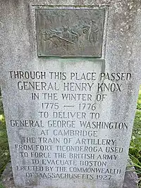 In 1926, the 150th anniversary of Knox's march, the states of New York and Massachusetts both began installing commemorative plaques at 56 locations in the two states that trace the route the expedition passed through.[3] The exact nature of the collaboration between the two states is unclear, however the work was completed in 1927.[3] The New York markers' bronze reliefs were designed by Henry James Albright, and the Massachusetts reliefs by Henry L. Norton.
