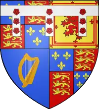 Elias Ashmole's Institutions, Laws and Ceremonies of the Most Noble Order of the Garter lists a coat of arms with three roses (one above the other) on each prong of the title.[63]