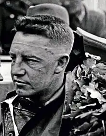 In the 1929 IOM Senior TT Tyrell-Smith began in the lead, and by the fourth lap was more than three minutes ahead. Then he crashed at Glen Helen, allowing a number of bikes to pass before he could rejoin, and this put Tim Hunt, on a Norton, in front. When Hunt had problems, Sunbeam's Charlie Dodson moved into the lead. Interest then began to focus on Tyrell-Smith, who, riding furiously, was making up time on the leaders. Dodson won, with his teammate Alec Bennett more than four minutes behind, and Tyrell-Smith only 50 seconds behind him, taking third. When he was examined after the race, it was found that he had leg injuries and three cracked ribs.[2] The Rudge team of those years consisted of competition manager Graham Walker, with Ernie Nott, and H.G. Tyrell Smith.[3]