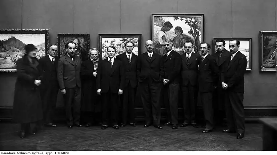 Hochman (centre) at an art opening in Kraków, January 1934, at the Kraków Society of Friends of Fine Arts gallery
