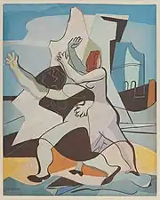In 1945, shortly after the war ended, Stażewski moved to Warsaw and was hired as the head of the art studio at the Military Geographical Institute.[16] He took an apartment on Piękna Street with the artists Jan Rogoyski and Maria Ewa Łunkiewicz-Rogoyska, a space that would become a nexus of Warsaw avant-garde artists and intellectuals in the following years.[16] During the early post-war era, he returned to painting and experimented with various modernist styles, including biomorphic abstraction—which evokes forms and shapes found in nature—and semi-figurative compositions inspired by Surrealism (evident, for instance, in the 1947 painting titled Escape).[4]: 125–126